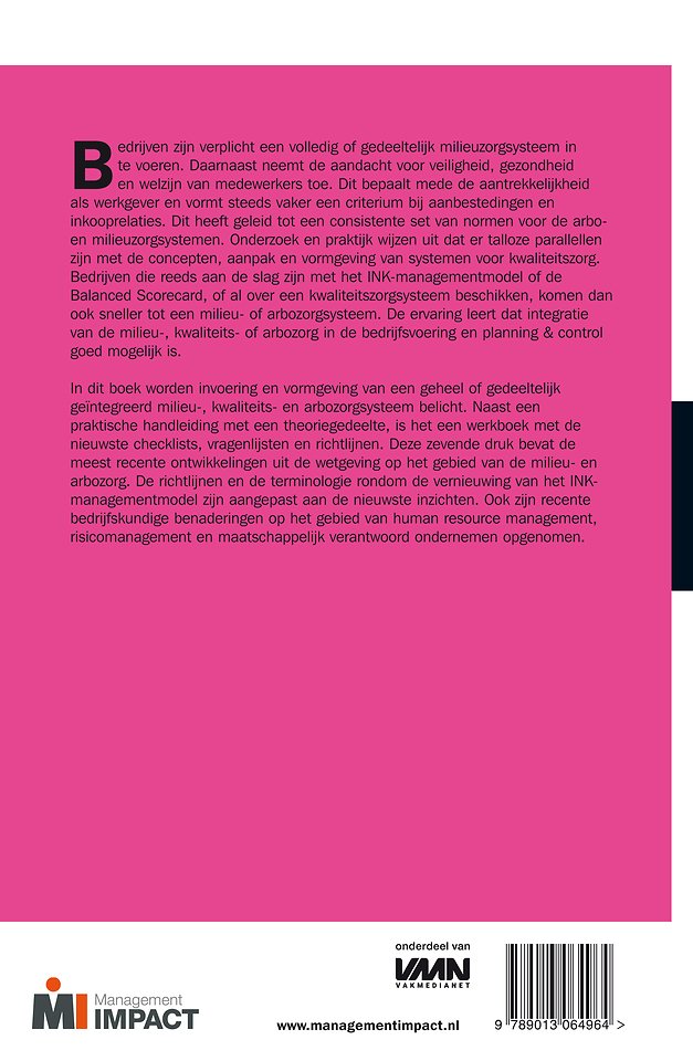 Deze zevende druk bevat de meest recente ontwikkelingen uit de wetgeving op het gebied van de milieu- en arbozorg. De richtlijnen en de terminologie rondom de vernieuwing van het INK- managementmodel zijn aangepast aan de nieuwste inzichten. Ook zijn recente bedrijfskundige benaderingen op het gebied van human resource management, risicomanagement en maatschappelijk verantwoord ondernemen opgenomen.