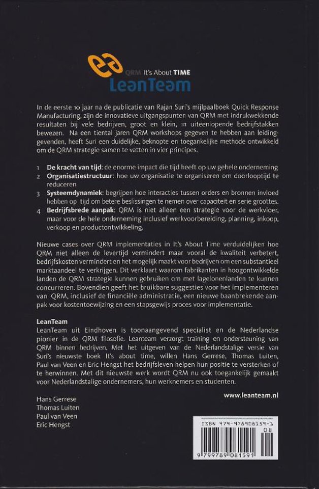 Nieuwe cases over QRM implementatie in 'It's about time' verduidelijken hoe QRM niet alleen de levertijd vermindert maar vooral de kwaliteit verbetert, bedrijfskosten vermindert en het mogelijk maakt voor bedrijven om een substantieel marktaandeel te verkrijgen. Dit verklaart waarom fabrikanten in hoogontwikkelde landen de QRM strategie kunnen gebruiken om met lagelonenlanden te kunnen concurreren. Bovendien geeft het bruikbare suggesties voor het implementeren van QRM inclusief de financiële administratie, een nieuwe baanbrekende aanpak voor kostentoewijzing en een stapsgewijs proces voor implementatie.