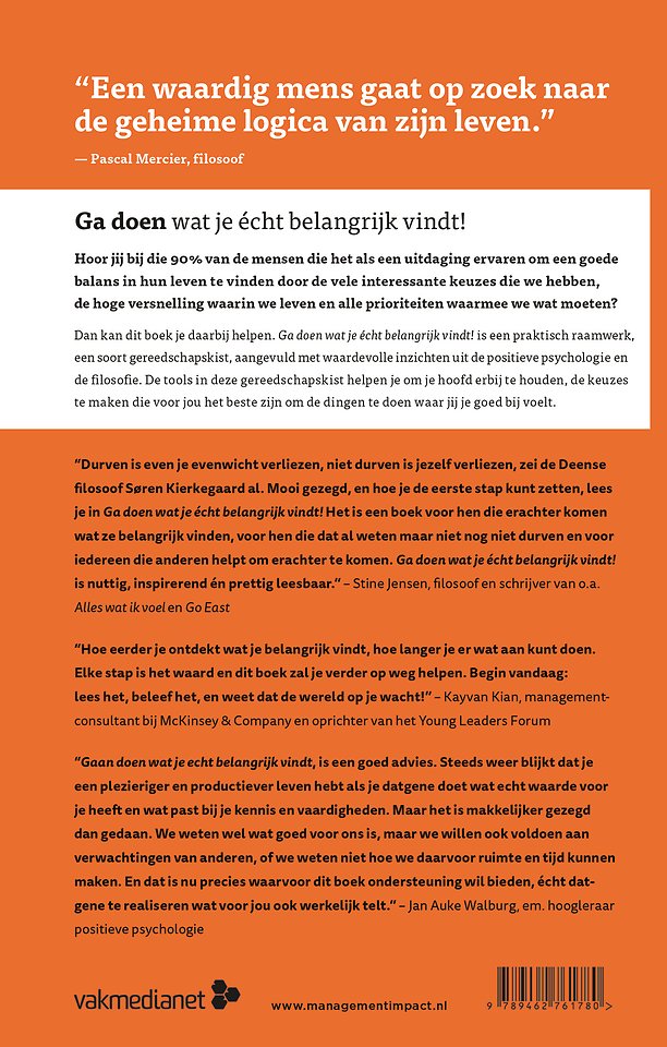 Meer over de auteursHoor jij bij die 90% van de mensen die het als een uitdaging ervaren om een goede balans in hun leven te vinden door de hoge versnelling waarin we leven en alle prioriteiten waarmee we wat moeten, de een nog urgenter dan de ander? Dan kan dit boek je daarbij helpen. 'Ga doen wat je écht belangrijk vindt!' is een praktisch raamwerk – zie het als een soort gereedschapskist - aangevuld met waardevolle inzichten uit de positieve psychologie en de filosofie.