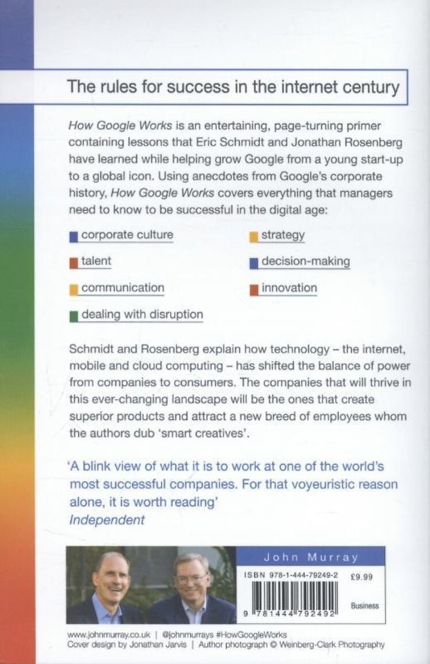 How Google Works is the sum of those experiences distilled into a fun, easy-to-read primer on corporate culture, strategy, talent, decision-making, communication, innovation, and dealing with disruption.The authors explain how the confluence of three seismic changes - the internet, mobile, and cloud computing - has shifted the balance of power from companies to consumers.