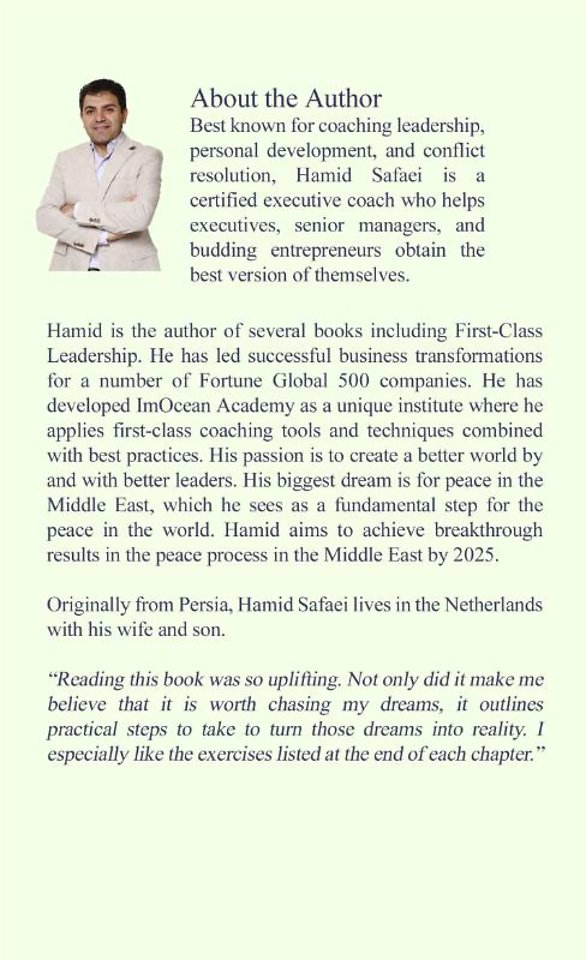 Author, Hamid Safaei has penned this book to help you on your journey to ultimate success. This book enables you to start realizing your dreams. If you follow the guidelines outlined in this book you will make breakthroughs you never dared to imagine. The goal-setting exercises will move you from a passive to a resourceful state and breakthrough your limiting beliefs. Follow these bulletproof steps and you will realize your dreams in no time. All you need is yourself, your time and your commitment to act.