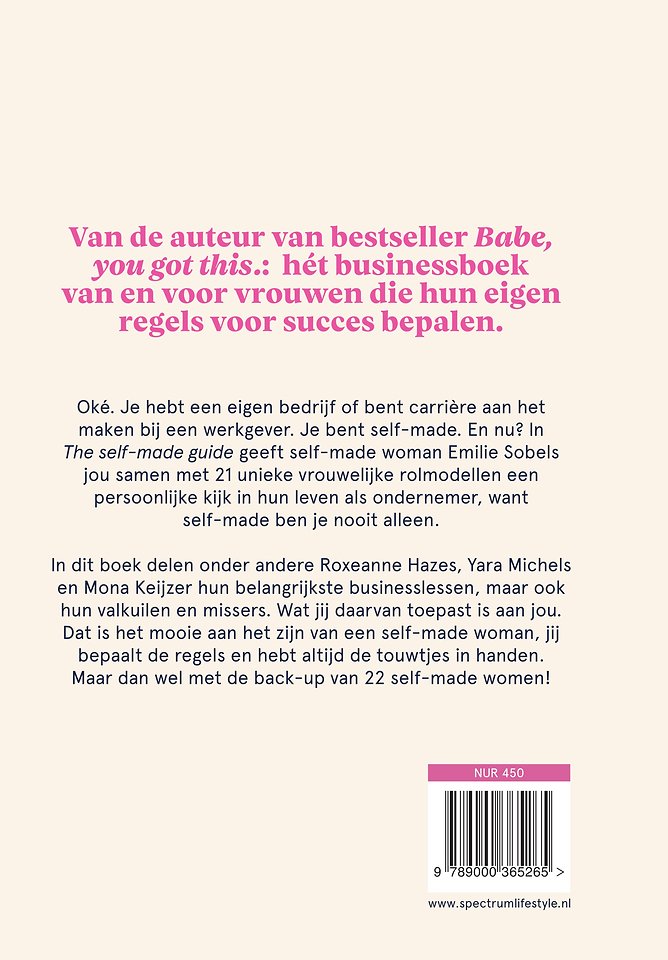 Oké. Je hebt een eigen bedrijf of bent carrière aan het maken bij een werkgever. Je bent self-made. En nu? In The self-made guide neemt self-made woman Emilie Sobels jou samen met 23 unieke vrouwelijke rolmodellen mee in hun leven als ondernemer, want self-made ben je gelukkig nooit alleen.