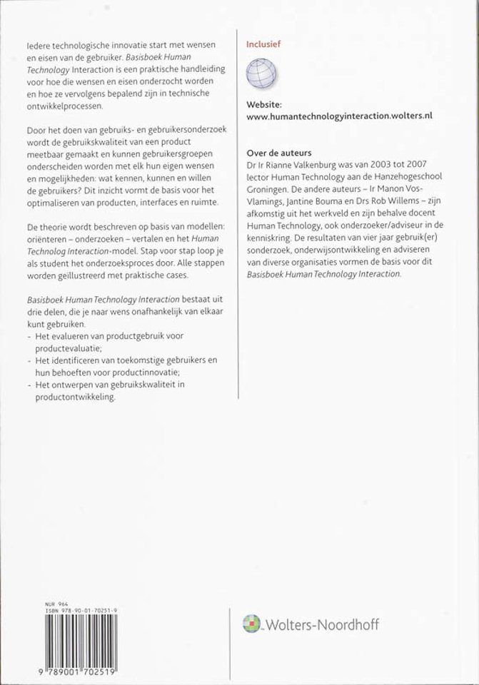 'Basisboek Human Technology Interaction' bestaat uit drie delen, die desgewenst onafhankelijk van elkaar te gebruiken zijn. Het eerste deel beschrijft het evalueren van productgebruik voor productevaluatie. Deel twee legt uit hoe toekomstige gebruikers geïdentificeerd kunnen worden en wat hun behoeften zijn voor productinnovatie. Het derde deel gaat over het ontwerpen van gebruikskwaliteit in productontwikkeling.
