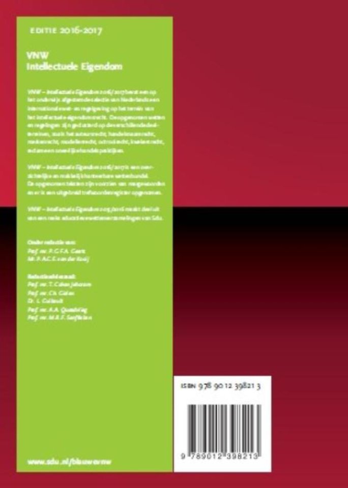VNW - Intellectuele Eigendom 2016/2017 bevat een op het onderwijs afgestemde selectie van Nederlandse en internationale wet- en regelgeving op het terrein van het intellectuele eigendomsrecht. De opgenomen wetten en regelingen zijn geclusterd op de verschillende deelterreinen, zoals het auteursrecht, handelsnaamrecht, merkenrecht, modellenrecht, octrooirecht, kwekersrecht, reclame en oneerlijke handelspraktijken.