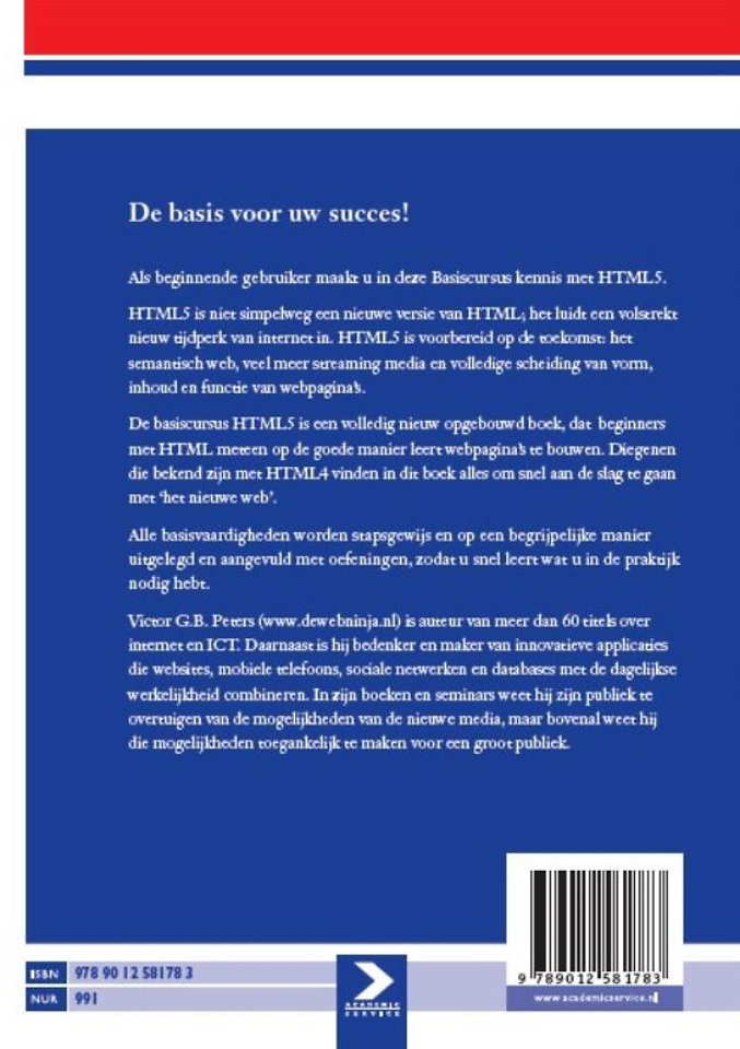 De 'Basiscursus HTML5' is een volledig nieuw opgebouwd boek, dat beginners met HTML meteen op de goede manier leert webpagina's te bouwen. Diegenen die bekend zijn met HTML4 vinden in dit boek alles om snel aan de slag te gaan met "het nieuwe web".