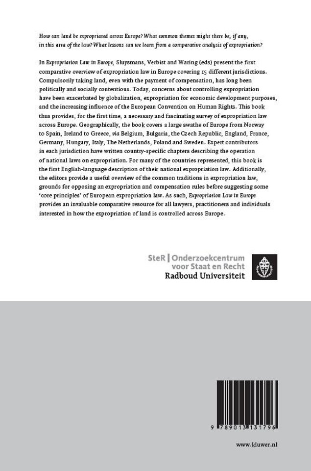 In 'Expropriation Law in Europe', Sluysmans, Verbist and Waring (eds) present the first comparative overview of expropriation law in Europe covering 15 different jurisdictions. Compulsorily taking land, even with the payment of compensation, has long been politically and socially contentious.