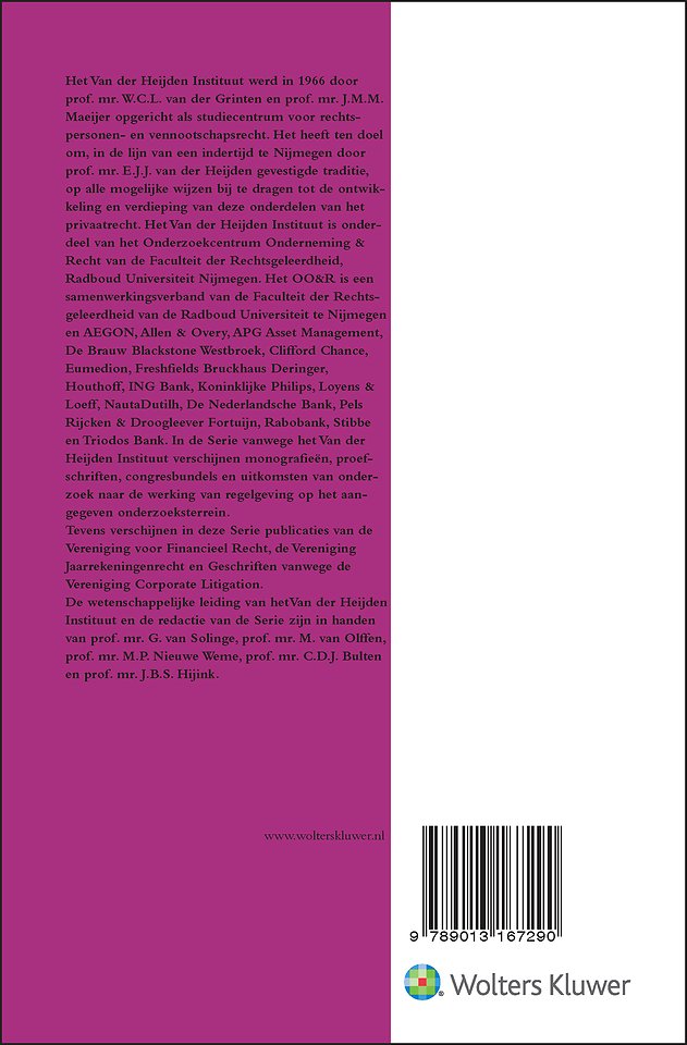 In de ‘Serie vanwege het Van der Heijden Instituut’ verschijnen monografieën, proefschriften, congresbundels en uitkomsten van onderzoek naar de werking van regelgeving op het aangegeven onderzoeksterrein. Tevens verschijnen in deze Serie publicaties van de Vereniging voor Financieel Recht, de Vereniging Jaarrekeningenrecht en Geschriften vanwege de Vereniging Corporate Litigation.