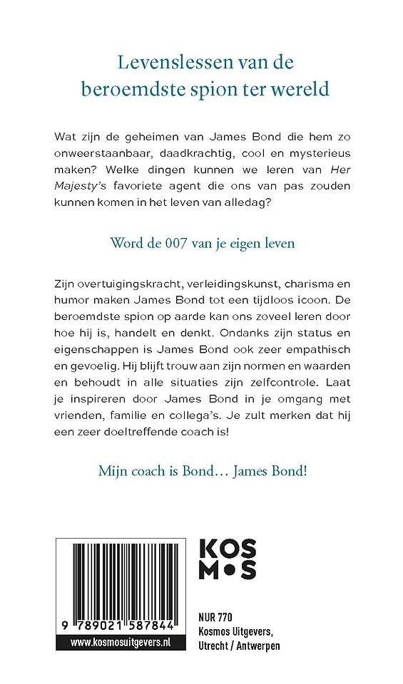 Levenslessen van de beroemdste spion ter wereld Zijn overtuigingskracht, verleidingskunst, charisma en humor maken James Bond tot een tijdloos icoon. De beroemdste spion op aarde kan ons zoveel leren door hoe hij is, handelt en denkt. Ondanks zijn status en eigenschappen is James Bond ook zeer empathisch en gevoelig. Hij blijft trouw aan zijn normen en waarden en behoudt in alle situaties zijn zelfcontrole. Laat je inspireren door James Bond in je omgang met vrienden, familie en collega’s. Je zult merken dat hij een zeer doeltreffende coach is!