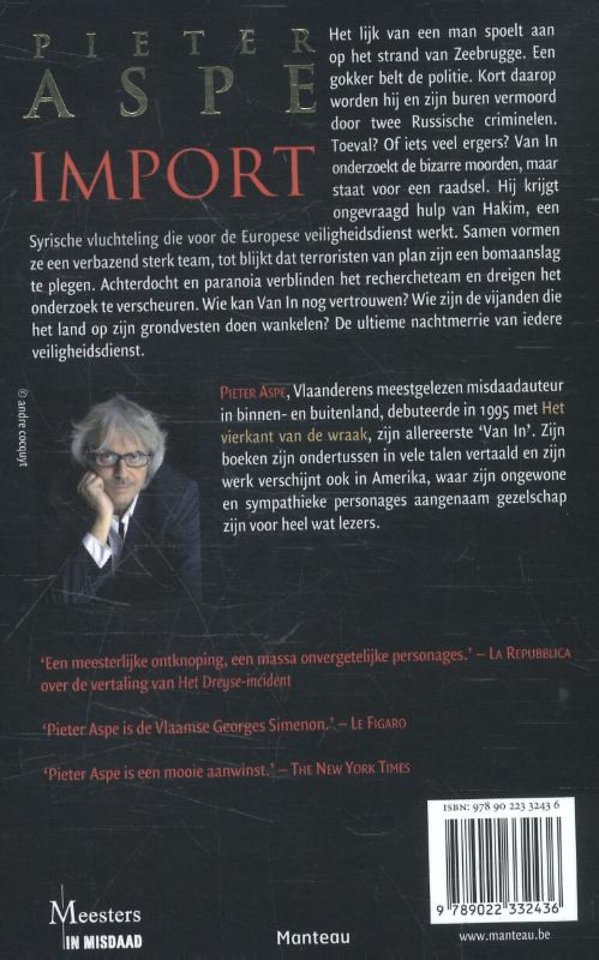 Pieter Aspe bedient zich in 'Import', net zoals in zijn vorige boek 'Het oor van Malchus', van het ‘wat als’-principe: wat als er tussen de massa’s vluchtelingen die in ons land aankomen een mol zit, met alleen maar slechte bedoelingen? In die zin kan 'Import' gelezen worden als het spiegelboek van 'Het oor van Malchus'. Met elk boek breidt Pieter Aspe zijn oeuvre uit met alleen maar sterker en treffender werk.