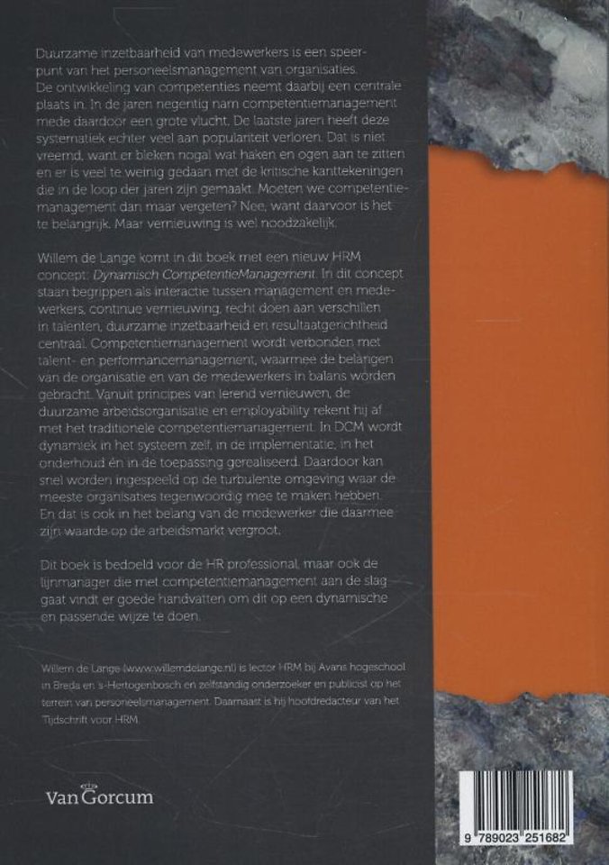 Willem de Lange komt in dit boek met een nieuw HRM-concept: Dynamisch Competentiemanagement. In dit concept staan begrippen als interactie tussen management en medewerkers, continue vernieuwing, recht doen aan verschillen in talenten, duurzame inzetbaarheid en resultaatgerichtheid centraal. Competentiemanagement wordt verbonden met talent- en performancemanagement, waarmee de belangen van de organisatie en van de medewerkers in balans worden gebracht. Vanuit principes van lerend vernieuwen, de duurzame arbeidsorganisatie en employability rekent hij af met het traditionele competentiemanagement. In DCM wordt dynamiek in het systeem zelf, in de implementatie, in het onderhoud én in de toepassing gerealiseerd. Daardoor kan snel worden ingespeeld op de turbulente omgeving waar de meeste organisaties tegenwoordig mee te maken hebben. En dat is ook in het belang van de medewerker die daarmee zijn waarde op de arbeidsmarkt vergroot.