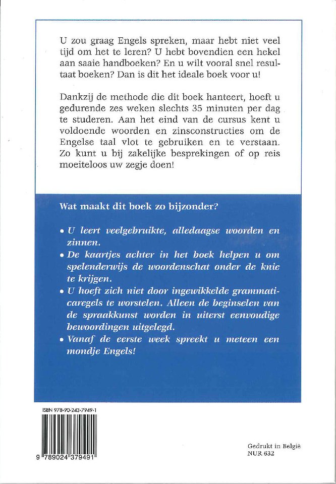 Dankzij de methode die dit boek hanteert, hoeft u gedurende zes weken slechts 35 minuten per dag te studeren. Aan het eind van de cursus kent u voldoende woorden en zinsconstructies om de Engels taal vlot te gebruiken en te verstaan. Zo kunt u bij zakelijke besprekingen of op reis moeiteloos uw zegje doen!
