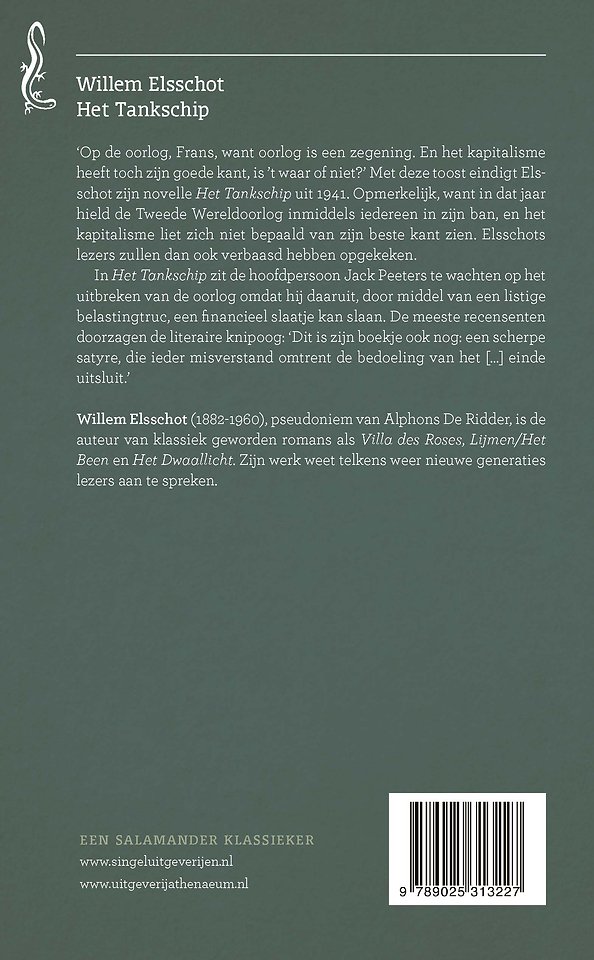 ‘Op de oorlog, Frans, want oorlog is een zegening. En het kapitalisme heeft toch zijn goede kant, is ’t waar of niet?’ Met deze toost eindigt Elsschot zijn novelle Het Tankschip uit 1941. Opmerkelijk, want in dat jaar hield de Tweede Wereldoorlog inmiddels iedereen in zijn ban, en het kapitalisme liet zich niet bepaald van zijn beste kant zien. Elsschots lezers zullen dan ook verbaasd hebben opgekeken.