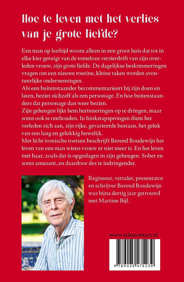 Met licht ironische toetsen beschrijft Berend Boudewijn het leven van een man wiens vrouw er niet meer is. En het leven mét haar, zoals dat is opgeslagen in zijn geheugen. Sober en soms amusant, en daardoor des te indringender.