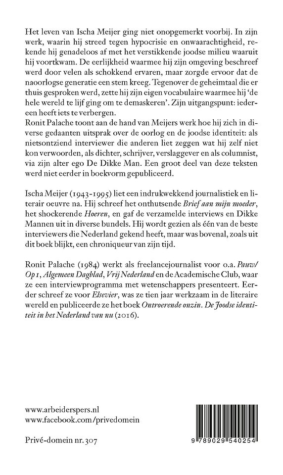 Ronit Palache toont aan de hand van Meijers werk hoe hij zich in diverse gedaanten uitsprak over de oorlog en de joodse identiteit: als nietsontziend interviewer die anderen liet zeggen wat hij zelf niet kon verwoorden, als dichter, schrijver, verslaggever en als columnist, via zijn alter ego De Dikke Man. Een groot deel van deze teksten werd niet eerder in boekvorm gepubliceerd.