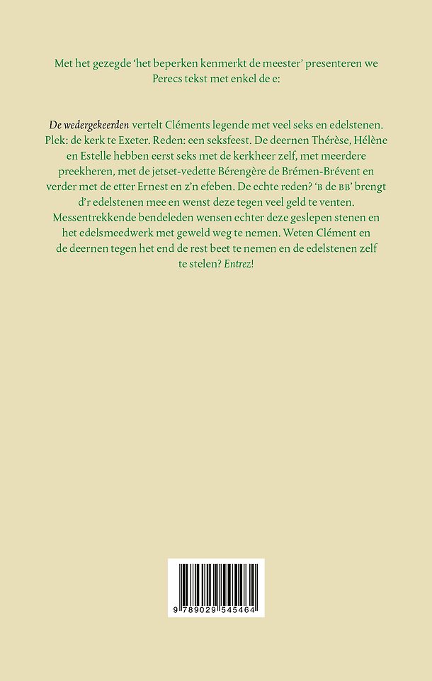 Deze vertaling van de roman Les Revenentes van Georges Perec is een nieuwe krachttoer van Guido van de Wiel. Twaalf jaar werkte hij aan De wedergekeerden (waarin als contrainte alleen de klinker e voorkomt). In zijn vertaling volgt Van de Wiel het origineel zowel qua vorm (lipogram) als inhoud. Eerder vertaalde hij van Perec (), waarin de letter e juist permanent afwezig is.