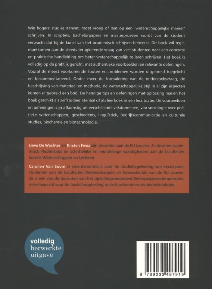 Dit boek wil tegemoetkomen aan de steeds terugkerende vraag van veel studenten naar een concrete en praktische handleiding om beter wetenschappelijk te leren schrijven. Het boek is volledig op de praktijk gericht, met authentieke voorbeelden en relevante oefeningen. Vooral de meest voorkomende fouten en problemen worden uitgebreid toegelicht en becommentarieerd.