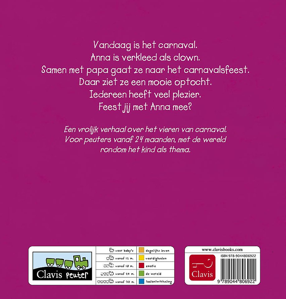 Vandaag is het carnaval. Anna is verkleed als clown. Samen met papa gaat ze naar het carnavalsfeest. Daar ziet ze een mooie optocht. Iedereen heeft veel plezier. Feest jij met Anna mee?