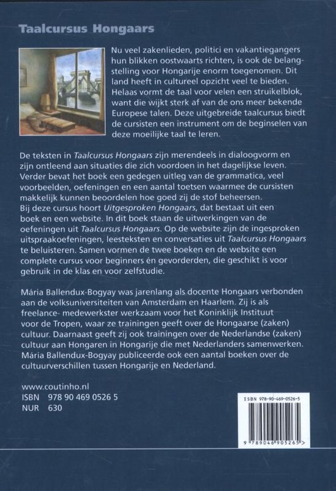 Nu veel zakenlieden, politici en vakantiegangers hun blikken oostwaarts richten, is ook de belangstelling voor Hongarije enorm toegenomen. Dit land heeft in cultureel opzicht veel te bieden. Helaas vormt de taal voor velen een struikelblok, want die wijkt sterk af van de ons meer bekende Europese talen. Deze uitgebreide taalcursus biedt hun een instrument om de beginselen van deze moeilijke taal te leren.