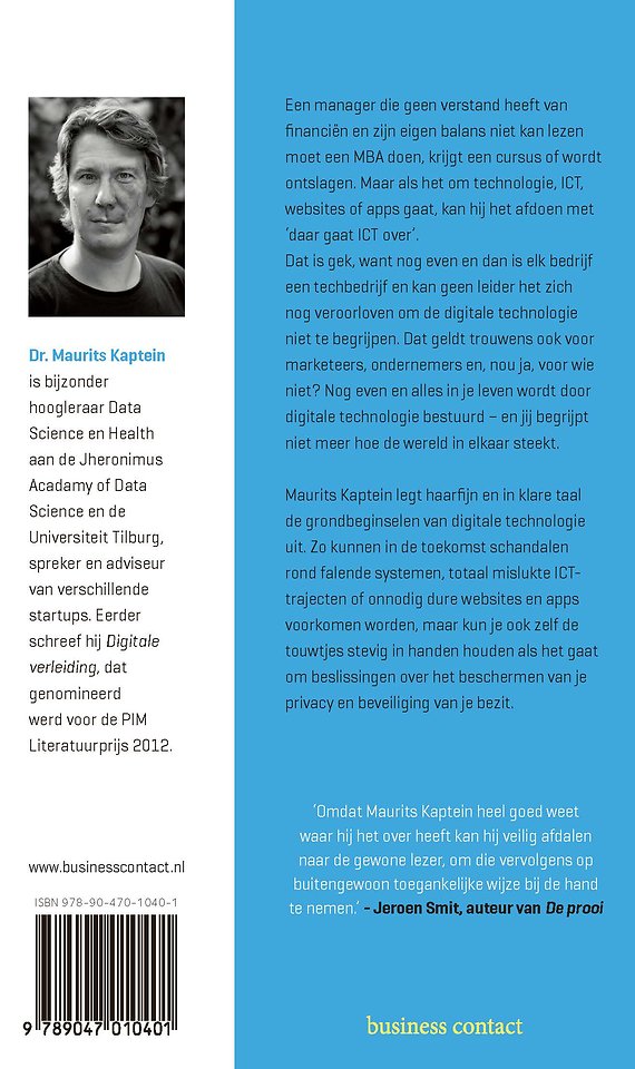 Maurits Kaptein legt haarfijn en in klare taal de grondbeginselen van digitale technologie uit. Zo kunnen in de toekomst schandalen rond falende systemen, totaal mislukte ICT-trajecten of onnodig dure websites en apps voorkomen worden, maar kun je ook zelf de touwtjes stevig in handen houden als het gaat om beslissingen over het beschermen van je privacy en beveiliging van je bezit.
