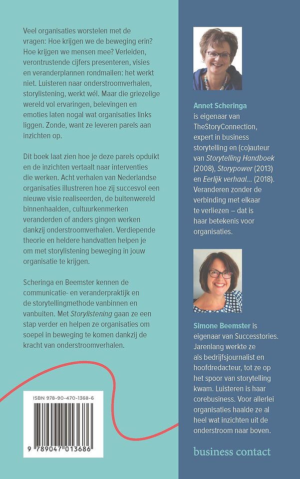 In 'Storylistening' geven Annet Scheringa en Simone Beemster antwoord op vragen waar veel organisaties mee worstelen. Vragen als: hoe krijgen we de beweging erin? Hoe krijgen we mensen mee? Verleiden, verontrustende cijfers presenteren, visies en veranderplannen rondmailen: het werkt niet. Luisteren naar onderstroomverhalen, storylistening, werkt wél. Maar die griezelige wereld vol ervaringen, belevingen en emoties laten nogal wat organisaties links liggen. Zonde, want ze leveren parels aan inzichten op.
