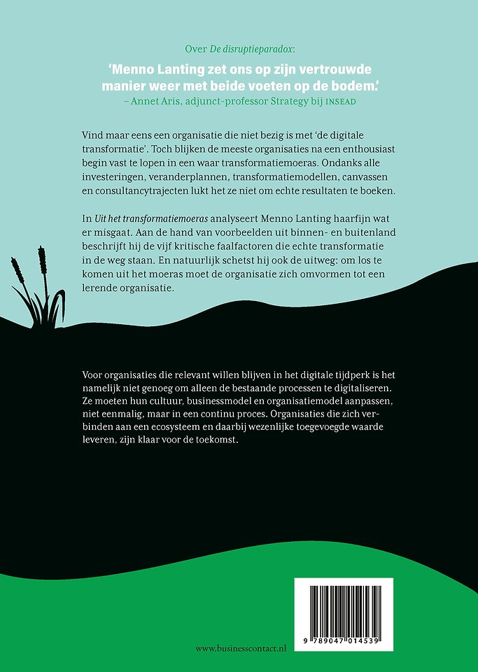 In Uit het transformatiemoeras analyseert Menno Lanting haarfijn wat er misgaat. Aan de hand van voorbeelden uit binnen- en buitenland beschrijft hij de vijf kritische faalfactoren die echte transformatie in de weg staan. En natuurlijk schetst hij ook de uitweg: om los te komen uit het moeras moet de organisatie zich omvormen tot een lerende organisatie.