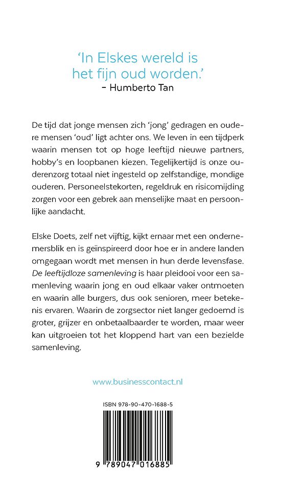 Elke Doets pleit in 'De leeftijdloze samenleving' voor een samenleving waarin jong en oud elkaar vaker ontmoeten en waarin alle burgers, dus ook senioren, meer betekenis ervaren. Waarin de zorgsector niet langer gedoemd is groter, grijzer en onbetaalbaarder te worden, maar weer kan uitgroeien tot het kloppend hart van een bezielde samenleving. De tijd dat jonge mensen zich ‘jong’ gedragen en oudere mensen ‘oud’ ligt achter ons.