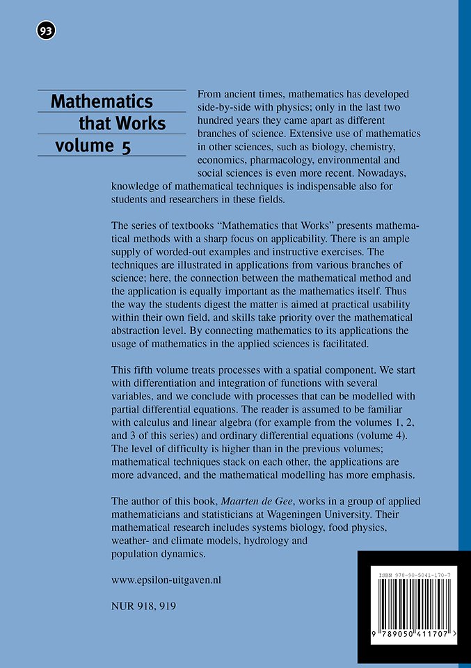 This fifth volume treats processes with a spatial component. We start with differentiation and integration of functions with several variables, and we conclude with processes that can be modelled with partial differential equations. The reader is assumed to be familiar with calculus and linear algebra (for example from the volumes 1, 2, and 3 of this series) and ordinary differential equations (volume 4). The level of difficulty is higher than in the previous volumes; mathematical techniques stack on each other, the applications are more advanced, and the mathematical modelling has more emphasis.