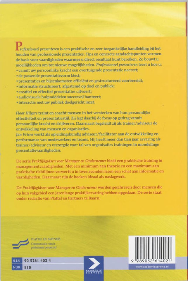'Professioneel presenteren' is een praktische en zeer toegankelijke handleiding bij het houden van professionele presentaties. Tips en concrete aandachtspunten vormen de basis voor vaardigheden waarmee u direct resultaat kunt bereiken. Zo bouwt u moeilijkheden om tot nieuwe mogelijkheden. 'Professioneel presenteren' leert u hoe u: