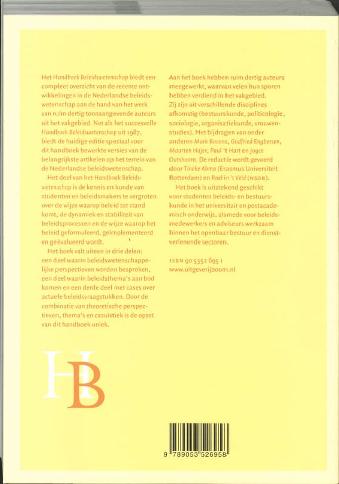 Het 'Handboek beleidswetenschap 'biedt een compleet overzicht van de recente ontwikkelingen in de Nederlandse beleidswetenschap aan de hand van het werk van ruim dertig toonaangevende auteurs uit het vakgebied. Net als het succesvolle 'Handboek beleidswetenschap 'uit 1987, biedt de huidige editie speciaal voor dit handboek bewerkte versies van de belangrijkste artikelen op het terrein van de Nederlandse beleidswetenschap.