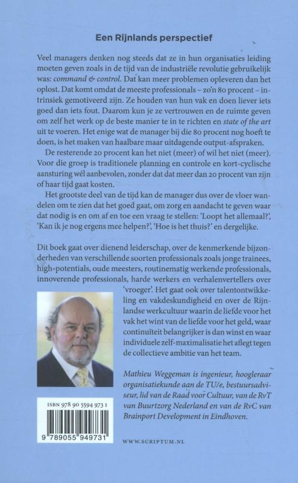 Dit boek gaat over dienend leiderschap, over de kenmerkende bijzonderheden van verschillende soorten professionals zoals jonge trainees, high-potentials, oude meesters, routinematig werkende professionals, innoverende professionals, harde werkers en verhalenvertellers over ‘vroeger’. Het gaat ook over talentontwikkeling en vakdeskundigheid en over de Rijnlandse werkcultuur waarin de liefde voor het vak het wint van de liefde voor het geld, waar continuïteit belangrijker is dan winst en waar individuele zelfmaximalisatie het aflegt tegen de collectieve ambitie van het team.