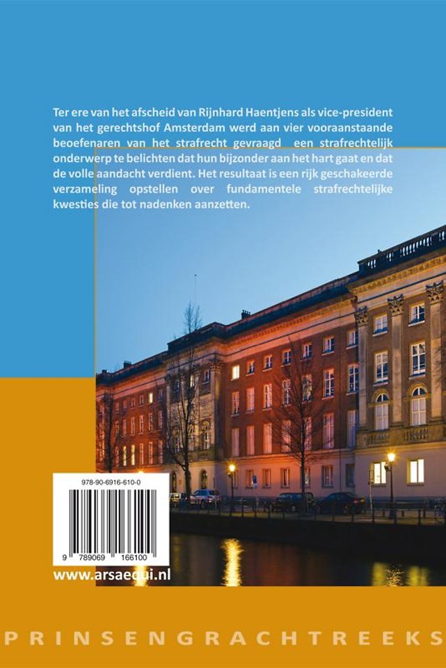 Ter ere van het afscheid van Rijnhard Haentjens als vice-president van het gerechtshof Amsterdam werd aan vier vooraanstaande beoefenaren van het strafrecht gevraagd een strafrechtelijk onderwerp te belichten dat hun bijzonder aan het hart gaat en dat de volle aandacht verdient. Het resultaat is een rijk geschakeerde verzameling opstellen over fundamentele strafrechtelijke kwesties die tot nadenken aanzetten.