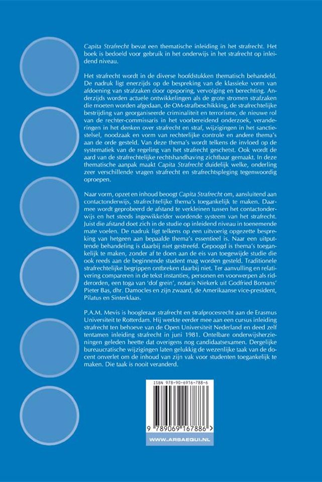 Naar vorm, opzet en inhoud beoogt 'Capita Strafrecht' om, aansluitend aan contactonderwijs, strafrechtelijke thema's toegankelijk te maken. Daarmee wordt geprobeerd de afstand te verkleinen tussen het contactonderwijs en het steeds ingewikkelder wordende systeem van het strafrecht. Juist die afstand doet zich in de studie op inleidend niveau in toenemende mate voelen. De nadruk ligt telkens op een uitvoerig opgezette bespreking van hetgeen aan bepaalde thema's essentieel is. Naar een uitputtende behandeling is daarbij niet gestreefd. Gepoogd is thema's toegankelijk te maken, zonder af te doen aan de eis van toegewijde studie die ook reeds aan de beginnende student mag worden gesteld. Traditionele strafrechtelijke begrippen ontbreken daarbij niet. Ter aanvulling en relativering compareren in de tekst instanties, personen en voorwerpen als ridderorden, een toga van 'dof grein', notaris Niekerk uit Godfried Bomans' Pieter Bas, dhr. Damocles en zijn zwaard, de Amerikaanse vice-president, Pilatus en Sinterklaas.