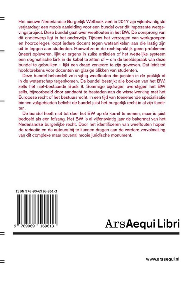 Het nieuwe Nederlandse Burgerlijk Wetboek viert in 2017 zijn vijfentwintigste verjaardag: een mooie aanleiding voor een bundel over dit imposante wetgevingsproject. Deze bundel gaat over weeffouten in het BW. De oorsprong van dit onderwerp ligt in het onderwijs. Tijdens het verzorgen van werkgroepen en hoorcolleges loopt iedere docent tegen wetsartikelen aan die lastig zijn uit te leggen aan studenten. Hoewel ze in de rechtspraktijk geen problemen (meer) opleveren, lijkt er ergens in zulke artikelen of het wettelijke systeem een dogmatische kink in de kabel te zitten of – om de beeldspraak van deze bundel te gebruiken – lijkt een draad verkeerd te zijn geweven. Dat leidt tot hoofdbrekens voor docenten en glazige blikken van studenten.