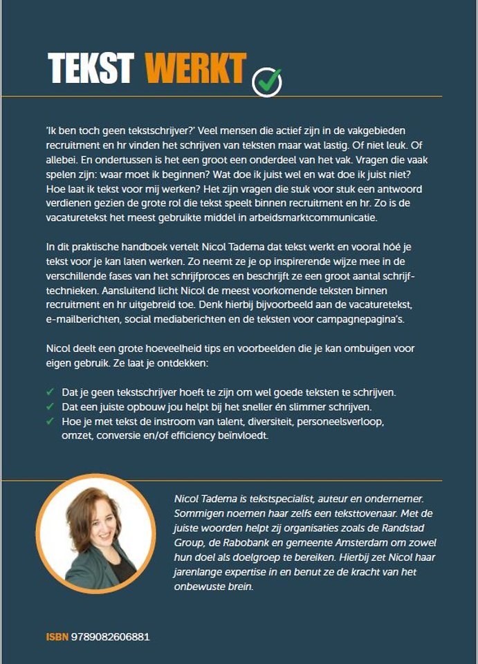 In dit praktische handboek vertelt Nicol Tadema dat tekst werkt en vooral hóé je tekst voor je kan laten werken. Zo neemt ze je op inspirerende wijze mee in de verschillende fases van het schrijfproces en beschrijft ze een groot aantal schrijftechnieken. Aansluitend licht Nicol de meest voorkomende teksten binnen recruitment en hr uitgebreid toe. Denk hierbij bijvoorbeeld aan de vacaturetekst, e-mailberichten, social mediaberichten en de teksten voor campagnepagina’s.