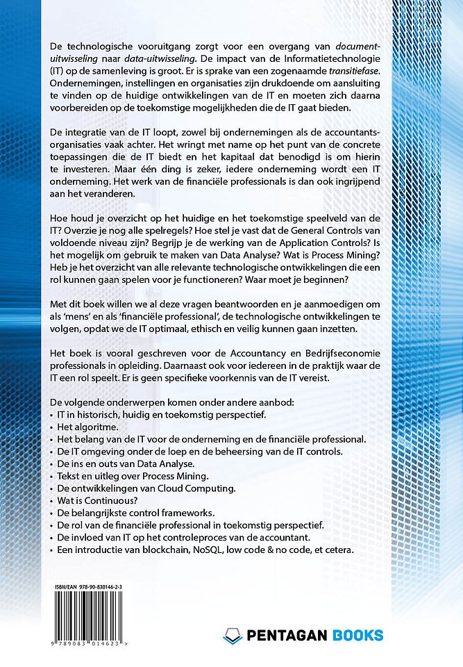 Met dit boek willen we al deze vragen beantwoorden en je aanmoedigen om als ‘mens’ en als ‘financiële professional’, de technologische ontwikkelingen te volgen, opdat we de IT optimaal, ethisch en veilig kunnen gaan inzetten. Het boek is vooral geschreven voor de Accountancy en Bedrijfseconomie professionals in opleiding. Daarnaast ook voor iedereen in de praktijk waar de IT een rol speelt. Er is geen specifieke voorkennis van de IT vereist.