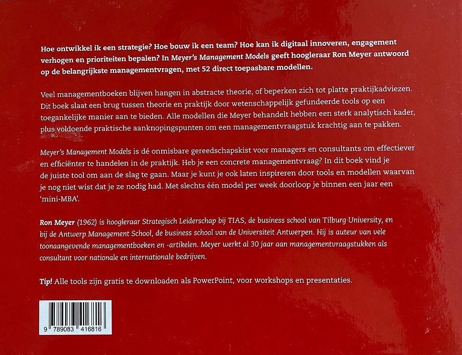 'Meyer’s Management Models' is dé onmisbare gereedschapskist voor managers en consultants om effectiever en efficiënter te handelen in de praktijk. Heb je een concrete managementvraag? In dit boek vind je de juiste tool om aan de slag te gaan. Maar je kunt je ook laten inspireren door tools en modellen waarvan je nog niet wist dat je ze nodig had. Met slechts één model per week doorloop je binnen een jaar een ‘mini-MBA’.