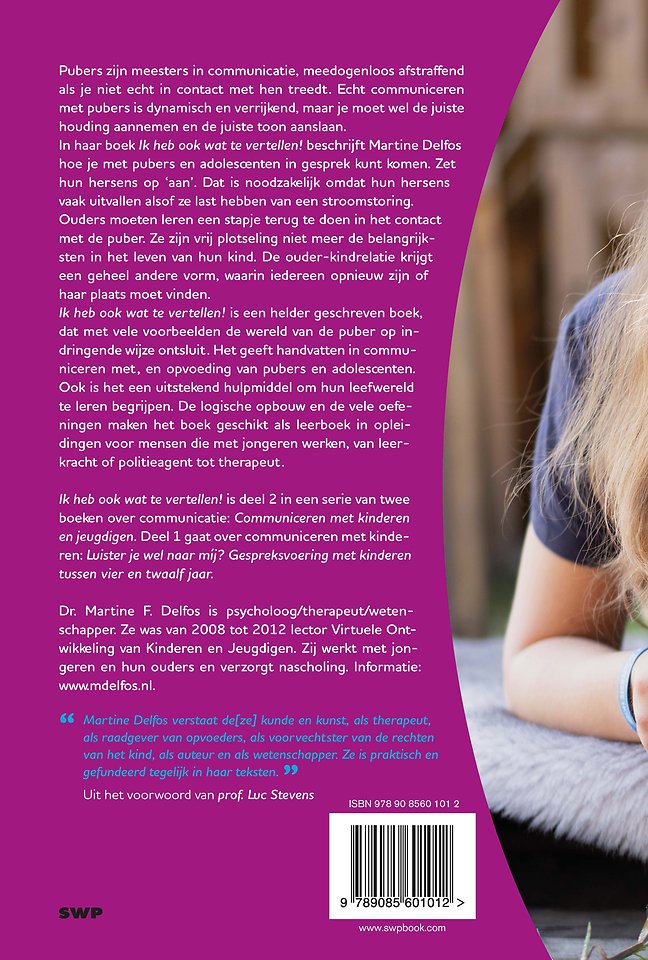 In haar boek Ik heb ook wat te vertellen! beschrijft Martine Delfos hoe je met pubers en adolescenten in gesprek kunt komen. De socratische wijze van communiceren zet de hersens van pubers op 'aan'. Dat is noodzakelijk omdat hun hersens vaak uitvallen alsof ze last hebben van een stroomstoring. Ouders moeten leren een stapje terug te doen in het contact met de puber. Ze zijn vrij plotseling niet meer de belangrijksten in het leven van hun kind. De ouder-kind relatie krijgt een geheel andere vorm, waarin iedereen opnieuw zijn of haar plaats moet vinden.