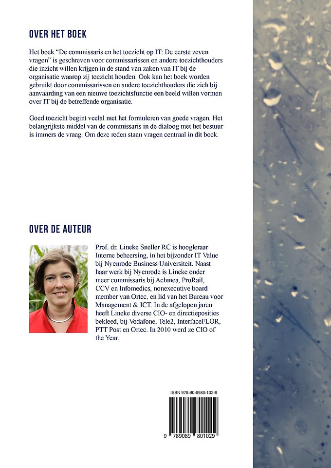 Dit boek is geschreven voor commissarissen en andere toezichthouders die inzicht willen krijgen in de stand van zaken van IT bij de organisatie waarop zij toezicht houden. Ook kan het boek worden gebruikt door commissarissen en andere toezichthouders die zich bij aanvaarding van een nieuwe toezichtsfunctie een beeld willen vormen over IT bij de betreffende organisatie.