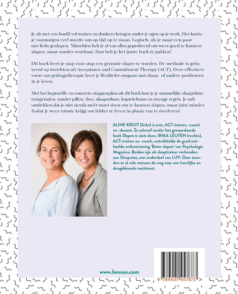 In dit praktische boek helpen slaapexperts Aline Kruijt en Irma Leijten je om meer grip te krijgen op je immer actieve brein en te breken met verkeerde slaapgewoonten. Dankzij hun beproefde stappenplan slaap je vlotter in en blijf je ook doorslapen. Zo ligt ook voor jou een heerlijke nachtrust binnen handbereik.
