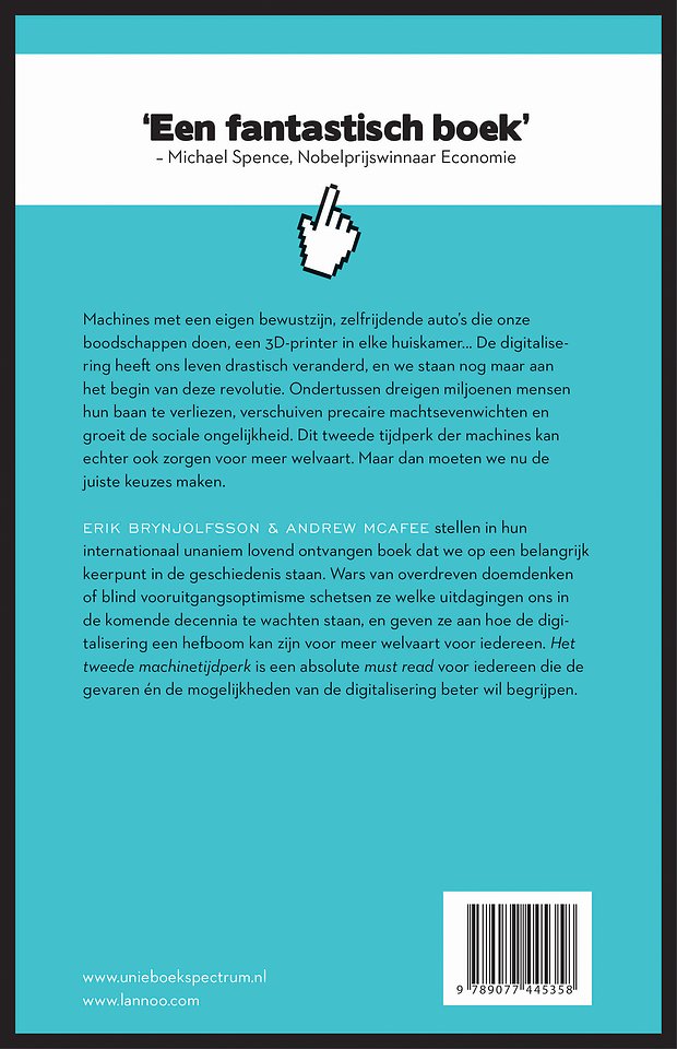 Erik Brynholfsson & Andrew McAfee stellen in hun internationaal unaniem lovend ontvangen boek dat we op een belangrijk keerpunt in de geschiedenis staan. Wars van overdreven doemdenken of blind vooruitgangsoptimisme schetsen ze welke uitdagingen ons in de komende decennia te wachten staan, en geven ze aan hoe de digitalisering een hefboom kan zijn voor meer welvaart voor iedereen. Het tweede machinetijdperk is een absolute must read voor iedereen die de gevaren én de mogelijkheden van de digitalisering beter wil begrijpen.