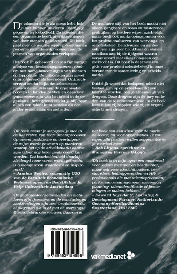 Ontnuchterend omdat blijkt dat selectiecommissies de sleutels van de organisatiepoorten in handen hebben en daardoor gatekeepers zijn van het talent in de organisatie; bevrijdend omdat je blijkbaar alleen een talent kunt worden als een ander je ziet staan en ziet zitten. De nuchtere stijl van het boek maakt niet alleen gangbare en soms ontluisterende praktijken op heldere wijze inzichtelijk, maar biedt ook aanknopingspunten voor het professionaliseren van wervings- en selectiebeleid. De adviezen en aanbevelingen zijn zeer bruikbaar en sluiten naadloos aan bij de tijdgeest waarin verantwoord met elkaar omgaan een zoektocht is. Dit boek is daarmee een gids voor prudent selectiebeleid in onze veranderende samenleving en arbeidsmarkt.