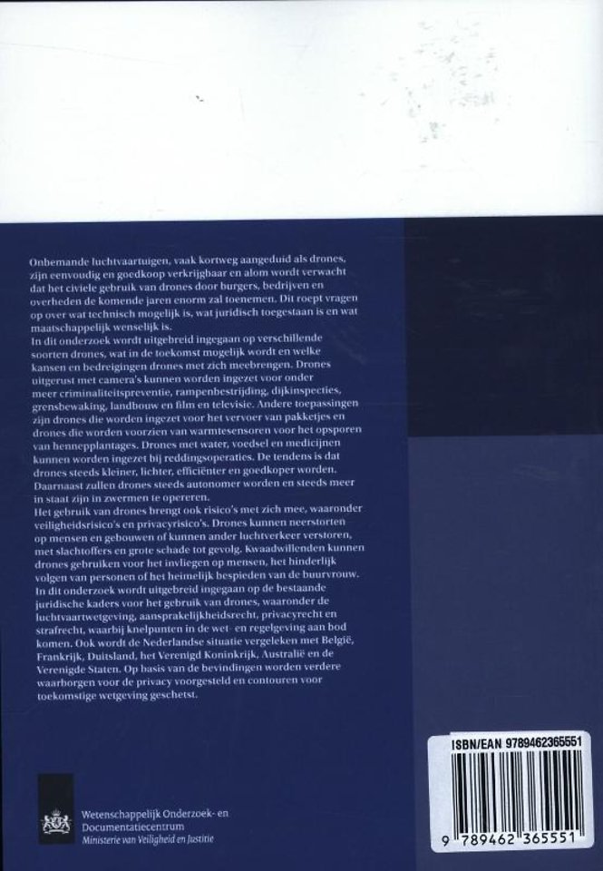 Onbemande luchtvaartuigen, vaak kortweg aangeduid als drones, zijn eenvoudig en goedkoop verkrijgbaar en alom wordt verwacht dat het civiele gebruik van drones door burgers, bedrijven en overheden de komende jaren enorm zal toenemen. Dit roept vragen op over wat technisch mogelijk is, wat juridisch toegestaan is en wat maatschappelijk wenselijk is.In dit onderzoek wordt uitgebreid ingegaan op verschillende soorten drones, wat in de toekomst mogelijk wordt en welke kansen en bedreigingen drones met zich meebrengen. Drones uitgerust met camera's kunnen worden ingezet voor onder meer criminaliteitspreventie, rampenbestrijding, dijkinspecties, grensbewaking, landbouw en film en televisie. Andere toepassingen zijn drones die worden ingezet voor het vervoer van pakketjes en drones die worden voorzien van warmtesensoren voor het opsporen van hennepplantages. Drones met water, voedsel en medicijnen kunnen worden ingezet bij reddingsoperaties. De tendens is dat drones steeds kleiner, lichter, efficiënter en goedkoper worden. Daarnaast zullen drones steeds autonomer worden en steeds meer in staat zijn in zwermen te opereren.Het gebruik van drones brengt ook risico's met zich mee, waaronder veiligheidsrisico's en privacyrisico's. Drones kunnen neerstorten op mensen en gebouwen of kunnen ander luchtverkeer verstoren, met slachtoffers en grote schade tot gevolg. Kwaadwillenden kunnen drones gebruiken voor het invliegen op mensen, het hinderlijk volgen van personen of het heimelijk bespieden van de buurvrouw. In dit onderzoek wordt uitgebreid ingegaan op de bestaande juridische kaders voor het gebruik van drones, waaronder de luchtvaartwetgeving, aansprakelijkheidsrecht, privacyrecht en strafrecht, waarbij knelpunten in de wet- en regelgeving aan bod komen. Ook wordt de Nederlandse situatie vergeleken met België, Frankrijk, Duitsland, het Verenigd Koninkrijk, Australië en de Verenigde Staten. Op basis van de bevindingen worden verdere waarborgen voor de privacy voorgesteld en contouren voor toekomstige wetgeving geschetst.