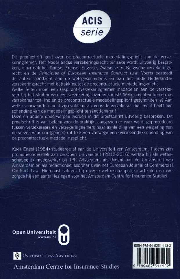 Welke feiten moet een (aspirant-)verzekeringnemer mededelen aan de verzekeraar bij het sluiten van een verzekeringsovereenkomst? Welke rechten komen de verzekeraar toe, indien de precontractuele mededelingsplicht geschonden is? Aan welke voorwaarden moet zijn voldaan alvorens de verzekeraar het recht heeft een schending van de mededelingsplicht te sanctioneren? Deze en andere onderwerpen worden in dit proefschrift uitvoerig besproken.