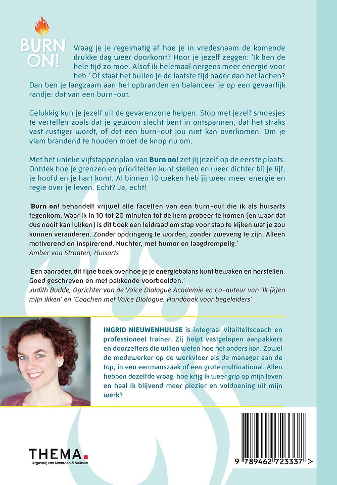 Met het unieke vijfstappenplan van Burn on! zet jij jezelf op de eerste plaats. Ontdek hoe je grenzen en prioriteiten kunt stellen en weer dichter bij je lijf, je hoofd en je hart komt. Al binnen 10 weken heb jij weer meer energie en regie over je leven. Echt? Ja, echt!