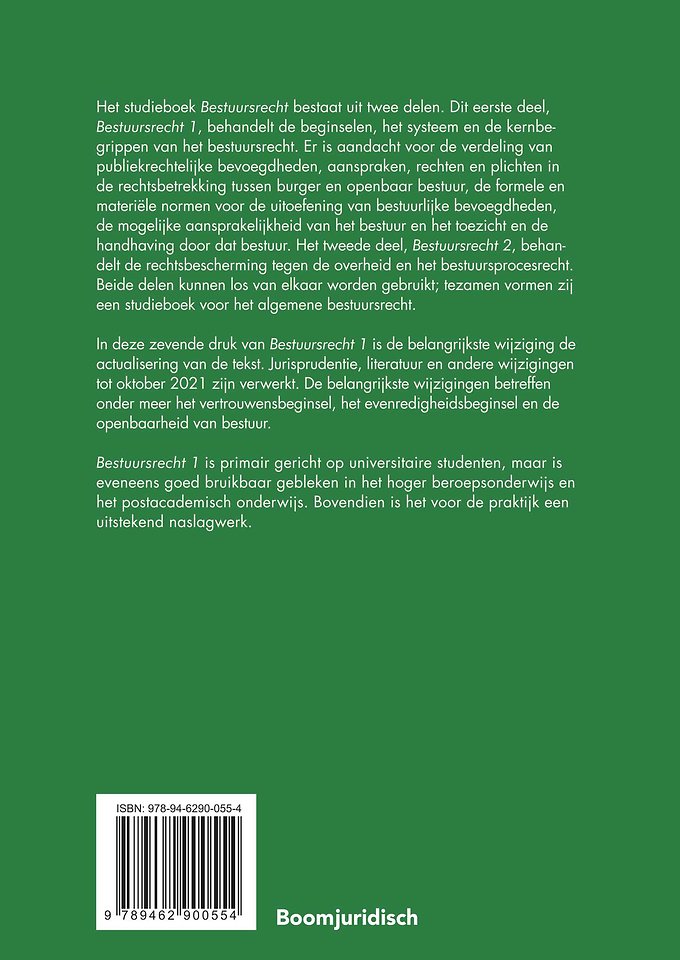 In deze zevende druk van Bestuursrecht 1 is de belangrijkste wijziging de actualisering van de tekst. Jurisprudentie, literatuur en andere wijzigingen tot oktober 2021 zijn verwerkt. De belangrijkste wijzigingen betreffen onder meer het vertrouwensbeginsel, het evenredigheidsbeginsel en de openbaarheid van bestuur.