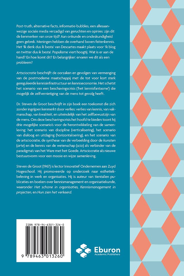 Dr. Steven de Groot beschrijft in zijn boek een toekomst die zich zonder ingrijpen kenmerkt door verlies: verlies van kennis, van vakmanschap, van kwaliteit, en uiteindelijk van het zelfbewustzijn van de mens. Om deze beschavingscrisis het hoofd te bieden toont hij drie mogelijke scenario’s voor de herontwikkeling van de samenleving: het scenario van discipline (verticalisering), het scenario van dialoog en uitdaging (horizontalisering), en het scenario van de artsciocratie, de synthese van de verbeelding door de kunsten (arte) en de kennis van de wetenschap (scio) als verbinder van de paradigma’s van het Ware met het Goede. Artsciocratie als nieuwe bestuursvorm voor een mooie en wijze samenleving.