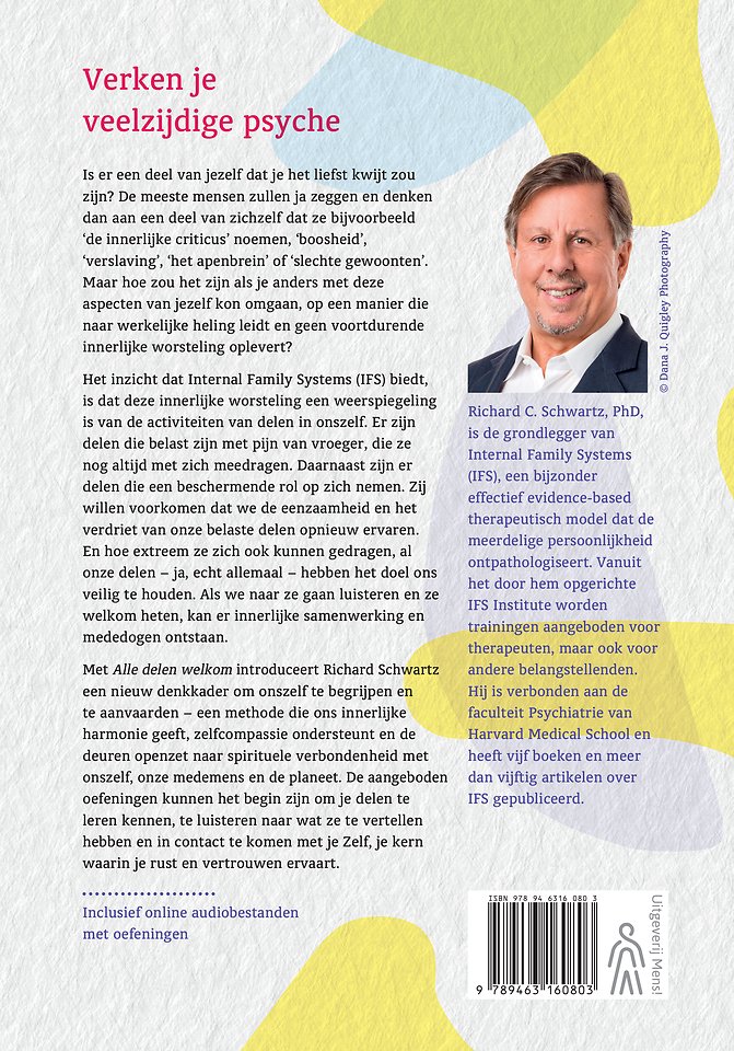 Met 'Alle delen welkom' introduceert Richard Schwartz een nieuw denkkader om onszelf te begrijpen en te aanvaarden – een methode die ons innerlijke harmonie geeft, zelfcompassie ondersteunt en de deuren openzet naar spirituele verbondenheid met onszelf, onze medemens en de planeet. De aangeboden oefeningen kunnen het begin zijn om je delen te leren kennen, te luisteren naar wat ze te vertellen hebben en in contact te komen met je Zelf, je kern waarin je rust en vertrouwen ervaart.