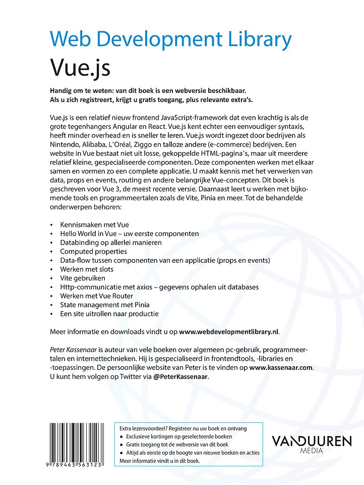 Deze componenten werken met elkaar samen en vormen zo een complete applicatie. U maakt kennis met het verwerken van data, props en events, routing en andere belangrijke Vue-concepten. Dit boek is geschreven voor Vue 3, de meest recente versie. Daarnaast leert u werken met bijkomende tools en programmeertalen zoals de Vite, Pinia en meer.