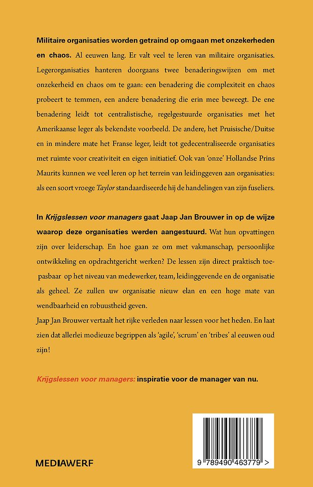 In 'Krijgslessen voor managers' gaat Jaap Jan Brouwer in op de wijze waarop deze organisaties werden aangestuurd. Hoe ze omgaan met wat we nu medewerkers en teams noemen. Wat zijn hun opvattingen over leidinggeven? Hoe creëren ze sociale cohesie en commitment. En vakmanschap, persoonlijke ontwikkeling, besluitvorming en opdrachtgericht werken?