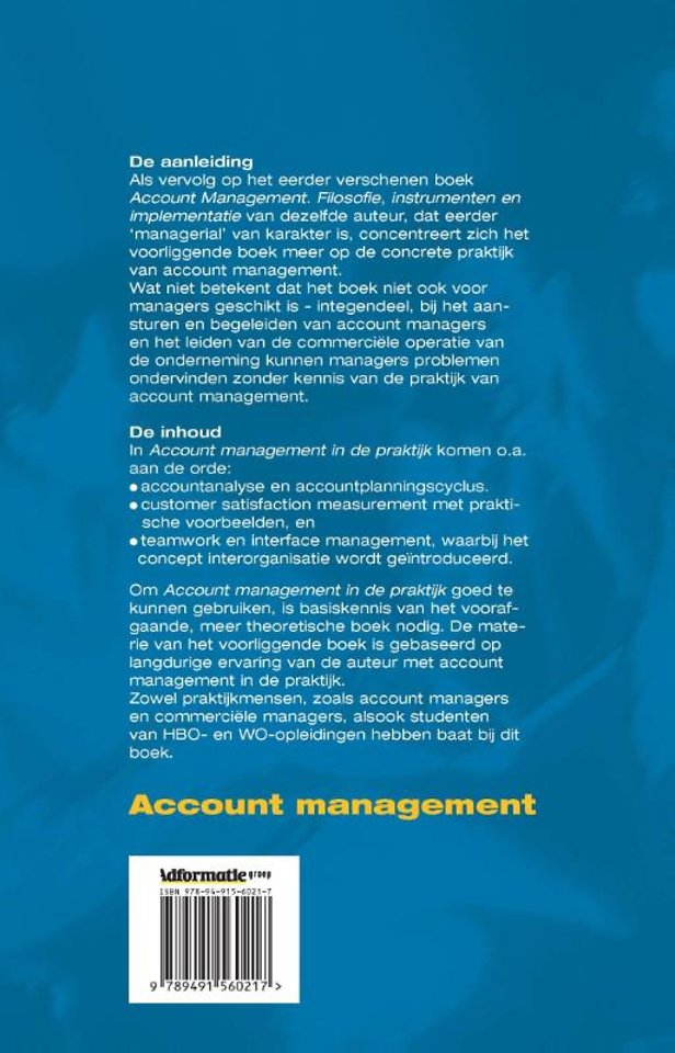 Om 'Account management in de praktijk' goed te kunnen gebruiken, is basiskennis van het voorafgaande, meer theoretische boek nodig. De materie van dit boek is gebaseerd op langdurige ervaring van de auteur met account management in de praktijk.